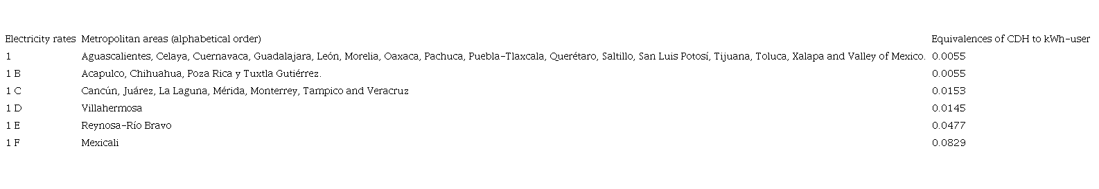 De Buen (2017) estimated annual electricity consumption for comfort in each residential electricity rate (1, 1A, 1B, 1C, 1D, 1E or 1F). These rates are established from the highest average monthly temperatures in three consecutive months over a period of five years, as stated in the Federal Official Gazette (DOF, 2002). Results by De Buen (2017) were used to convert values to energy needs (in kWh, per electric service user). The 30 metropolitan areas were classified according to their electricity rate; an average CDH was taken from those with the same rate. The last column of Table II shows these equivalencies. Since the rate districts 1 and 1A had no data on average annual consumption for comfort, they got the same values of rate 1B.