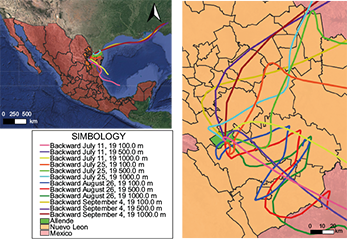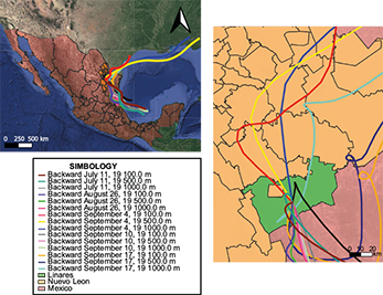 Backward trajectories of rain events collected during winter and summer, at Linares and Allende rural sites, showed that only for Allende site a possible carry-over of pollutants is observed during summer, since winds preferably come from the northern part of the MAM during that season. However, it is recommended to carry out further analyzes on winds throughout the year, to more clearly detect possible sources of emissions that could affect Allende and Linares sites.