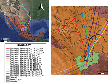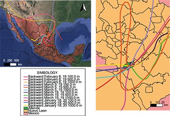 The backward air mass trajectories (48 h) at the Allende site for all the events collected during winter, are presented in Figure 8a, show that most of the winds come from the center of the country; only on 8 February 2019 the winds came from the north, crossing the northern of the State of Sonora and Chihuahua, until reaching Allende, without crossing the MAM. Only the trajectory of 5 March 2019 at an AGL of 500m, completely crossed the MAM from the northernmost part in Apodaca municipality and left through the municipality of Santiago, reaching Allende.