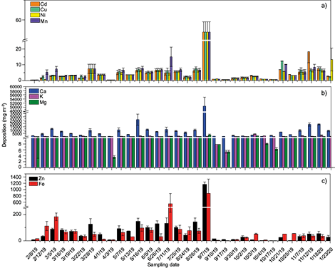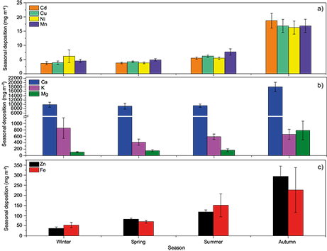 Seasonal deposition was analyzed to determine the influence of seasonality on deposition behavior for the chemical elements during the studied period, as seen in Figure 9. Deposition of Zn and Fe was higher during autumn, an increasing trend observed in the deposition of these elements from winter to autumn. Similarly, deposition of Cd, Cu, Ni and Mn increase from winter to autumn, reaching maximum values during autumn. In contrast, deposition of K is largest in winter and decreases in the rest of the seasons. Finally, Ca and Mg show a maximum in autumn and remain fairly constant throughout the other seasons.