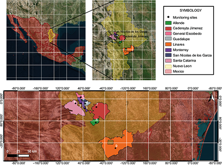This work was carried out in the MAM which is a highly urbanized area (4,106,054 inhabitants) (SEMARNAT, 2016), as well as a two rural areas in NL (Linares and Allende). The MAM has a semidry and warm climate, with an annual average precipitation of 623 mm, mean temperature of 32 ºC, with extreme temperatures during summer (40 ºC) and winter (-2 ºC) (Gobierno del Estado de Nuevo León, 2016). The urban areas are represented by different industrial activities such as metallurgy, chemistry, petrochemistry, pharmacy, textiles, ceramics, tannery, electronics, automobiles, aviation, building materials, machine manufacturing, iron and steel foundries, paper, asbestos, cement and wood (Valdez Cerda et al., 2011). The rural areas are classified as touristic and agricultural citrus areas (Alcalá Escamilla and López López, 2017). In the rural areas the climate is semi-warm and subhumid, with an average of 749 mm of summer rainfall; annual average temperature of 22 ºC in one site (Linares) and 15.8 ºC in the other (Allende), with an extreme maximum of 40.1 ºC and an minimum of -2.4 ºC (INAFED, 2010).