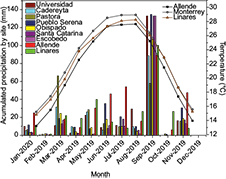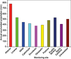 The trends of the monthly accumulated precipitation by monitoring site and the average monthly temperature can be seen in Figure 2b. No rain events are shown in the month of December because rain events only occurred between December 21 and 30. However, the rain recorded on those days was below 0.1 mm, on average, which was not enough to perform the chemical analysis. For this reason, no data points are presented for the month of December. The dominant annual winds for the MAM are from the east-northeast and southeast (Loya-Gonzalez et al., 2020), and for the rural areas from the east and southeast.