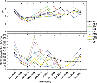 The results of the Kruskal-Wallis tests applied to all the data (including all samples) indicate that the pH values did not show significant differences among the monitoring sites (p=0.86) nor between the urban and rural areas (p=0.500), but there were significant differences (p≤0.05) for the season of the year as well as the rainfall events. Post hoc Kruskal-Wallis test showed significant differences in pH values for the seasons, all seasons differ from each other (p <0.05), except for summer compared to autumn. In addition, significant differences between rain events were observed, where the events that stand out are March 28, April 1, and September 10, 2019. This may be due to the fact that during the months of March and September the amount of precipitation was greater than for the rest, therefore a lower pH value was found during these events due to a dilution effect.