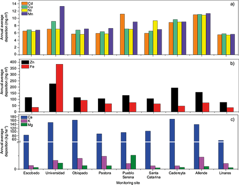 The trend of the annual accumulated deposition by monitoring site and element is illustrated in Figure 5. Notice that the annual deposition trend of metals is similar between monitoring sites, despite the great difference among the urbanization characteristics of sites and distance between them. Rural areas may be connected to the air basin of the MAM due to similarities in metal composition. Despite the fact that Fe and Zn deposition are higher at the Universidad site, the Mann Withney U test does not detect significant differences between this site and the rest, as previously mentioned. The high value of Fe and Zn may be due to the proximity of the Universidad site to metallurgical industries, that are one of the most important industrial activities in the region. In a previous study it was found that Fe was one of the main elements deposited via atmosphere at Universidad site, which was also determined in this study (Céron et al., 2018).