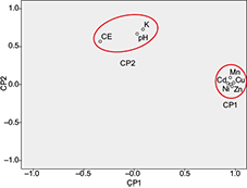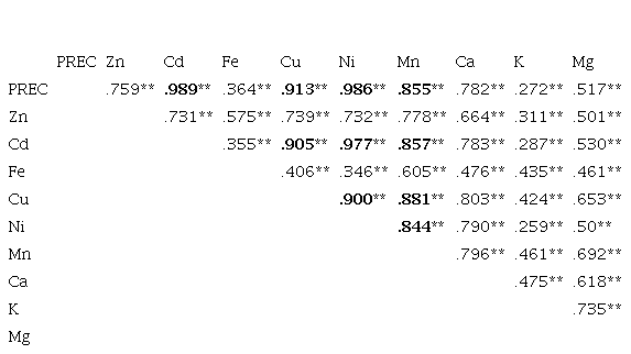 With the purpose of recognizing distribution patterns of the elements through the monitoring sites and the possible source from which they come from, the correlation between the elements was analyzed and a factorial analysis of reduction of dimensions by principal components was used. In pollution analysis, the correlations between two metals regularly indicates that these elements come from the same source when the correlation is positive, while a negative correlation shows that they come from different sources (Naifar et al., 2018; Chen et al., 2019). The correlations showed to be significant between the elements analyzed, finding a high positive correlation for Cd-Cu, Cd-Ni, Cd-Mn, Cu-Ni, Cu-Mn and Ni-Mn. In addition to this, the rest of the elements showed medium to low positive correlations, as observed in Table V. Also precipitation amount shown a highly positive correlation with all the metals (at 0.78 to 0.98).