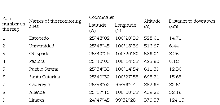 The MAM is composed of 13 municipalities, only 6 of which were sampled in this study (Santa Catarina, General Escobedo, Monterrey, Guadalupe, Cadereyta Jiménez, and San Nicolás). The municipalities of the rural area considered are Allende and Linares. The sampling points in the urban area (MAM) were placed within the environmental monitoring stations belonging to the state government of NL. Sampling points in the rural areas were placed within the educational facilities of the Autonomous University of Nuevo Leon. Sampling points in the rural areas were located near agricultural citrus orchards. Table I shows the location of the monitoring sites, the altitude, and the distance of the monitoring site to downtown Monterrey, considered as the central point from which the sampling starts along the urbanization gradient. Sampling within the metropolitan area was chosen with a preferential trend from the center to the south of the metropolitan area, taking only one point to the north (General Escobedo), in order to connect the MAM with the southern region of the state of Nuevo Leon, through the National Highway 85, which is an important access road within the state and for the MAM. It connects the south of the country with the MAM, allowing for important commercial exchange in the area and thus leading to a high load of vehicular traffic. The selected rural areas are regions of commercial importance for the state (Allende and Linares). In addition to the relevance of their agricultural and handicraft products, these are regions that have recreational areas for the population living within the MAM, which are frequently visited on weekends or holidays. The locations of each monitoring site and the municipalities that were considered to carry out the present study are shown in Figure 1.