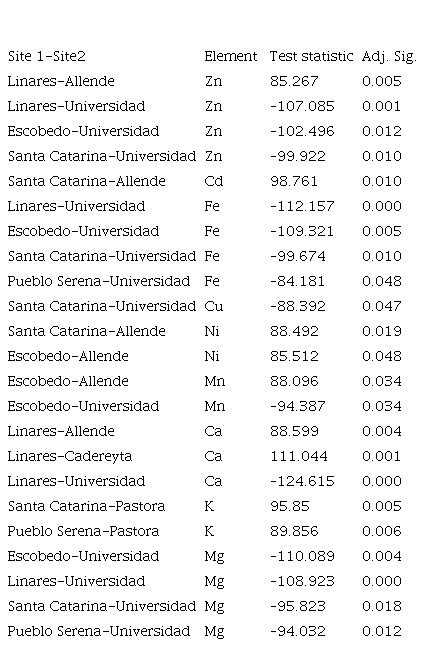 Rainfall events show significant differences for all the deposited elements analyzed and between monitoring sites (p≤0.05). Likewise, they show significant diferences between urban and rural sites for Cd, Fe, Ni and Ca (p≤0.05), but not for Zn (p=0.654), Cu (p=0.296), Mn (p=0.579), K (p=0.537) and Mg (p=0.094). Post hoc test showed that tropical storm Fernand marked the difference for all the elements with respect to other rainfall events. Also, a remarkable difference was found between the Linares site with respect to Universidad site, for Fe and Ca deposition.