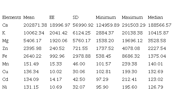 With the aim of knowing the possible sources of origin of the elements analyzed in the present study, the EF was calculated taking Fe as a conservative element for metals and Ca for the larger ions (Ca, K and Mn). The EF was calculated based on Equation 1.