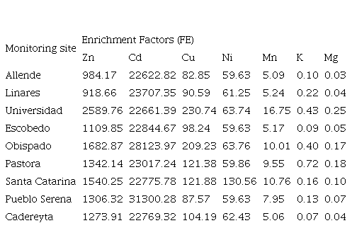 Enrichment Factors calculated for all elements at each site, using Fe and Ca as conservative elements, showed that Zn and Cd exhibit a high enrichment, while Cu and Ni have a moderate enrichment in all sites. On the other hand, only K, Mg and Mn were not enriched, except for EF values for Mn in Universidad and Santa Catarina, where enrichment was moderate.
