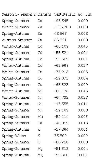 In the case of deposition variability between seasons, the Krusakall-Wallis test shows significant differences for all elements (p≤0.05) except for Fe (p=0.444). Post hoc tests between seasons and differences between couples of seasons for each element are shown in Table VI. Results show that the spring-autumn, spring-summer, and winter-autumn pairs present the largest differences for all elements.