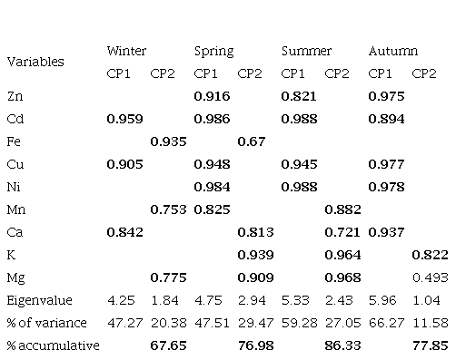 Seasonal deposition showed that Fe, Zn, Cd, Cu, Ni, Mn, Ca, and Mg were higher during autumn; in contrast, K was higher during winter. Seasonal PCA shows that during spring and summer deposition separates more clearly into metals and elements of crustal origin, like the global PCA. On the other hand, during winter and autumn, the patterns change with respect to those reported by the global PCA and the rest of the seasons, maintaining a particular pattern for autumn and for winter.