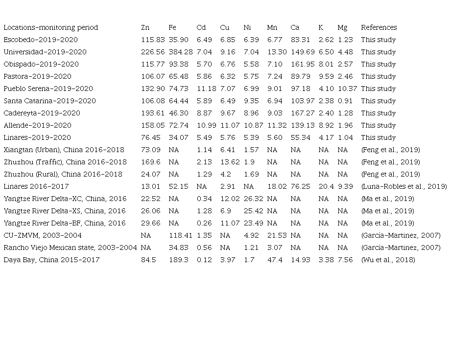 Fe values for the University site are higher than those reported in the Daya Bay in China (Wu et al., 2018) and they are also higher than those reported for the CU-Metropolitan Area of the Valley of Mexico (García-Martínez, 2007), as well to the other values obtained for the rest of the monitoring sites of this investigation. Furthermore, the Cd reported here exceeds all values of other studies given in Table VIII, and the Ni value is only exceeded by the location reported from Yangtze River Delta in China (Ma et al., 2019). In the case of Mn deposition, Luna-Robles et al. (2019) in Linares, Mexico, and Wu et al. (2018) in Daya Bay, China, showed greater depositions values than those obtained in all sites in this study. Calcium exceeds all values reported in other studies, but in the case of Linares site the Ca deposited is lower than the reported for the same site during 2016-2017 (Luna-Robles et al., 2019). K and Mg values reported by the previous study in Linares site are higher than in this study, only Mg values in Pueblo Serena site are greater than those previously reported (Luna-Robles et al., 2019).