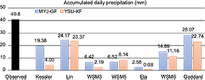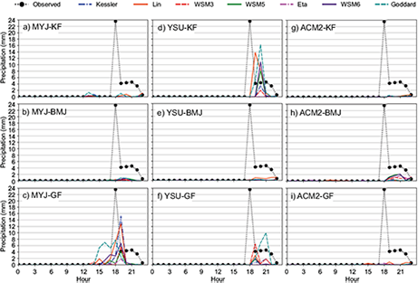 The MYJ-GF, YSU-KF, and YSU-GF schemes (depending on the MP scheme adopted) were able to simulate the precipitation peaks with time lags and quantitative errors (Fig. 9c, d, f).