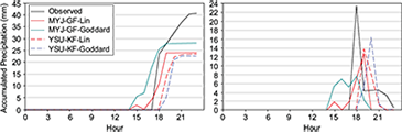 The YSU-KF case (Fig. 9d) also achieved reasonable results. However, the occurrence of rainfall was simulated to occur an hour after the event. The MP-Lin produced a rainfall value of 13.8 m, and Goddard produced a value of 5 mm at 19 h. YSU-KF-Goddard (16.2 mm), WSM6 (10.9 mm), Lin (8.3 mm), WSM5 (8.1 mm), Kessler (3.5 mm), and WS3 (2 mm) also simulated precipitation values, but with a time lag of 2 h. The MP-Eta configuration did not produce any rainfall. The WSM5 and WSM6 exhibited similar behavior, except for WSM3. The YSU-GF ensembles (Fig. 9f) also exhibited some peaks in the time-series plots; however, the rainfall values were smaller than the results obtained using YSU-KF.