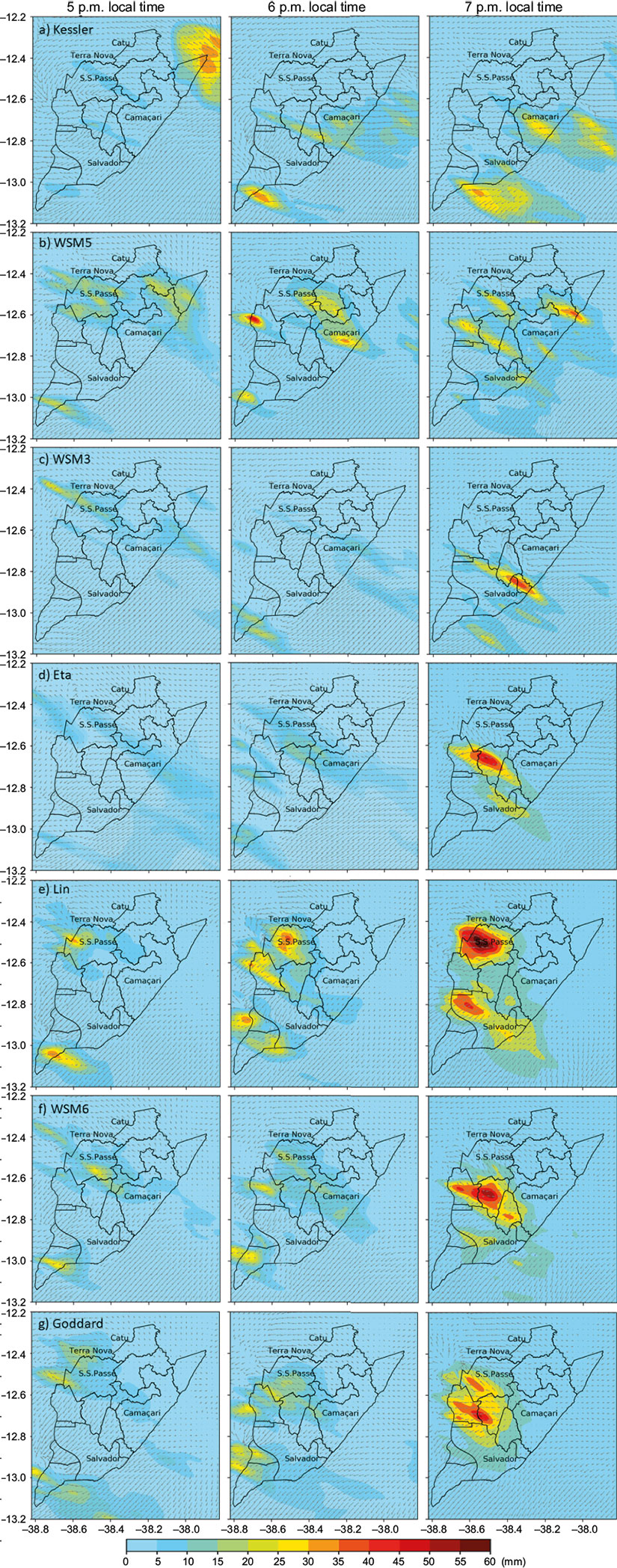 It is simple to distinguish the most suitable MP schemes by visual comparison for this event. The arrival of the subtropical storm was reasonably depicted by Lin, WSM6 and Goddard MP schemes (Fig. 12e-g), which reproduced the evolution of this subtropical storm throughout the hours, with Lin simulation yielding the highest total precipitation rates. Kessler and WSM5 had similar results and emulated the arrival of the event with weak magnitude and patterns precipitation (Fig. 12a, b), despite Kessler is the least complex scheme used. Meanwhile, WSM3 and Eta (Fig. 12c, d) awerend delayed and presented much weaker precipitation fields, therefore they were not suitable for this event. Similar results were found in Sun et al. (2019), who conducted experiments of a typhoon case in South China.