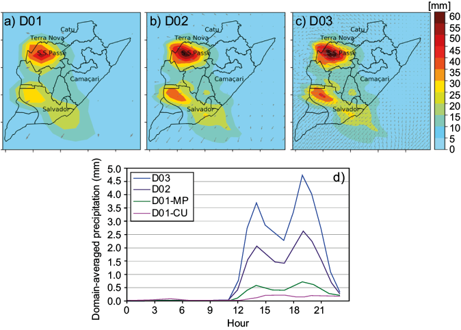 As the peak rainfall was registered in the region between 17:00-18:00 LT, rainfall modeled across the entire domain started to be predicted 5 h before the actual peak, with the highest modeled values occurring at 19:00 LT (Fig. 13d). The highest modeled rainfall rates were concentrated over the São Sebastião do Passé (see S.S.Passé in the spatial distribution of Fig.13c) county. Terra Nova and Salvador municipalities, especially over the BTS, also were affected by the subtropical storm Guará. Additionally, over the surrounding areas, where there are large areas of vegetation and water bodies, the wind fields were smaller and divergent. The wind fields agreed with the observed wind roses, which indicates that most of the winds originated from the north, north-northeast, and northeast areas and blew toward the southwest and south-southwest.
