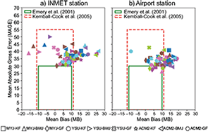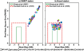 Figure 2 shows the comparison soccer plot for the RMSE and MB statistical metrics of WS10 from the INMET and Airport meteorological stations.
