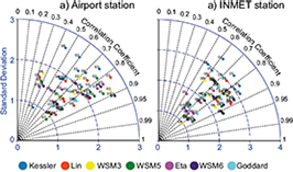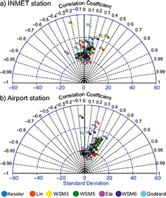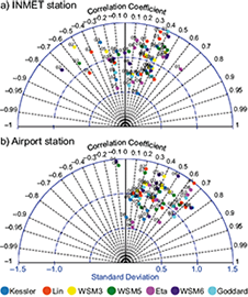 Figure 7 shows the T2 comparison Taylor diagram for the SD (blue line) and R (black line) statistical metrics at the INMET and Airport meteorological stations.