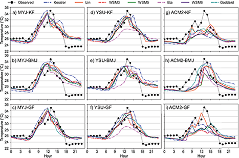 Figure 6 shows an hourly comparison of T2 between observed and modeled data at the INMET station on December 9, 2017, which was the hottest day in 2017 registered in the region, with a thermal amplitude of 11.8 ºC. This great variation could be challenging for the model to emulate, even though most of the simulations could depict this oscillation (Fig. 6).