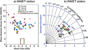 Figure 8 shows the RH2 comparison soccer plot and Taylor diagram for the MAGE, MB, SD, and R statistical metrics at the INMET meteorological station.