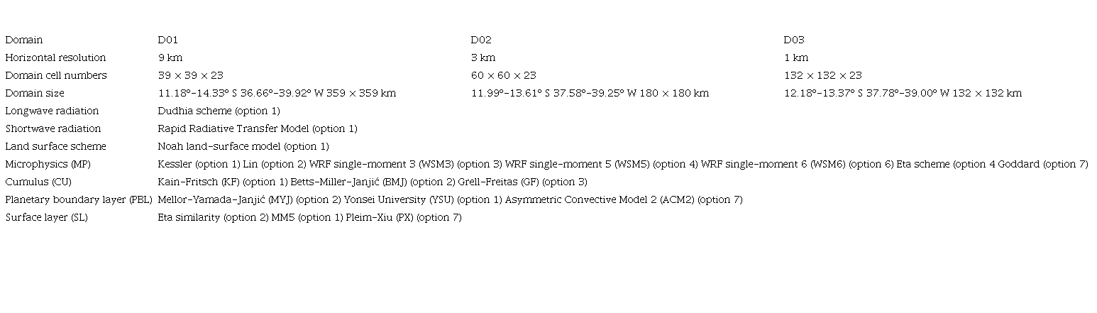 The mesoscale numerical Weather Research and Forecasting (WRF) model, which is an advanced atmospheric model, allows users to select physics and dynamics settings that can be more suitable for a given region, and has gained wider popularity due to its various applications that aid the performance of numerical experiments, allowing a better understanding of the atmospheric dynamics of some episodes or phenomena such as precipitation, heat and cold events, pollution, wind cycles, and severe storms. However, some physical processes cannot be described by traditional fluid mechanics equations; therefore, several researchers have undertaken the development of a parameterization that can effectively describe the spatial and temporal evolutions of these processes (Chen et al., 1996; Koren et al., 1999; Chen and Dudhia, 2001; Salvador et al., 2016). It is widely agreed that the best model configuration will depend on the studied area and time of the year, and relevant research has been mainly conducted in tropical and mid-high latitudes (Jiménez et al., 2006; Balzarini et al., 2014; Carvalho et al., 2014; Ekström, 2015; Banks et al., 2016; Sharma et al., 2016; Avolio et al., 2017; Powers et al., 2017; Imran et al., 2018; Lian et al., 2018; Tymvios et al., 2018), with few studies conducted in tropical and coastal regions or lower latitudes (Hariprasad et al., 2014; Boadh et al., 2016; Gunwani and Mohan, 2017; Penchah et al., 2017).