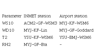 Table II shows the configuration of PBL, MP, and CU schemes that were highlighted considering the statistical indices for WS10, WD10, T2 and RH2 and each station. The scoring procedure was used for the selection of each configuration. The MYJ-PBL and GF-CU schemes could be reasonable for evaluations related to wind direction and relative humidity, whereas the YSU- PBL and WSM6-MP schemes for temperature.