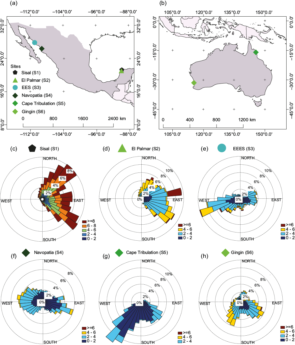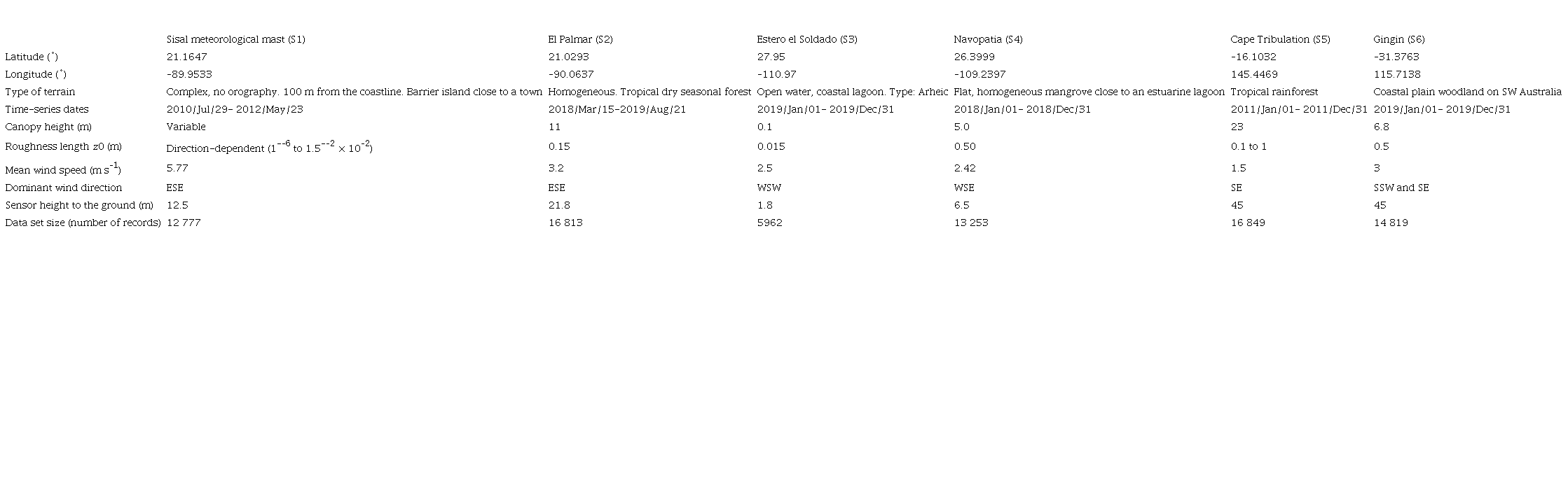 The proposed semi-empirical relationship (Eqs. 2 and 3) was calibrated at six sites with contrasting wind regimes. Table I shows the site locations and experiment characteristics (such as height above ground of the instruments, canopy height, measurement dates, number of records and mean wind speed). Figure 1 shows the map location (upper panel) and the wind roses for each location (lower panel). Note that a different color scale is used in S1 (wind rose) due to its high wind speed average. The site names (and acronyms in parenthesis) are also shown. They are grouped according to their geographical situation in: (1) Gulf of Mexico data sets, (2) Gulf of California data sets, and (3) Australia data sets.