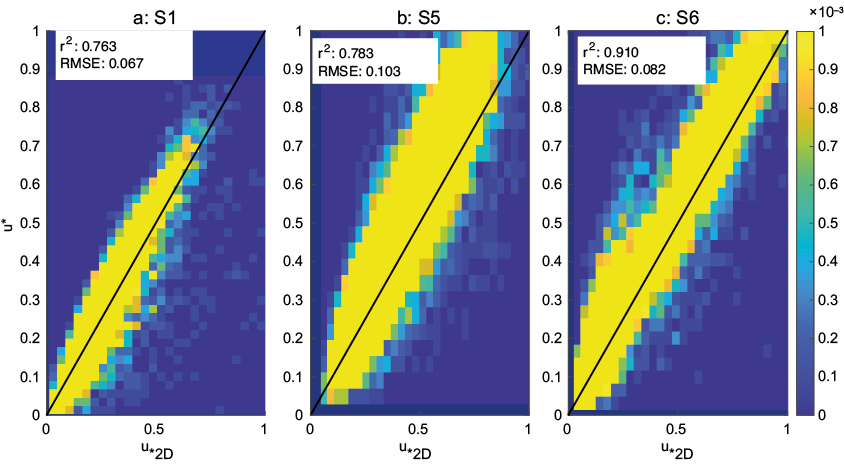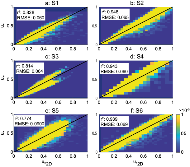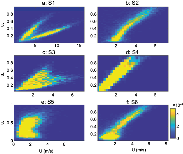 Figure 2a-f shows the relationship between friction velocity u* and the mean horizontal wind speed (2D) U for all the experimental sites (S1 to S6). Instead of using point clouds, we decided to plot a 2D probability histogram (PDF) based on a set of (forty) data bins, so a color scale can tell the regions with more frequency of occurrence.