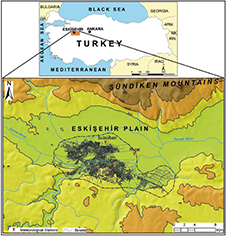 The study area is the city of Eskişehir, located on a plain (760-800 masl) in the Upper Sakarya subregion of Central Anatolia, Turkey (39º 49’-39º 43’ N, 30º 24’-30º 43’ E). The city is surrounded by the Sündiken mountains and high plateaus to the north. It is divided by the Porsuk stream, a branch of Sakarya river flowing from north to the south (Fig. 1).