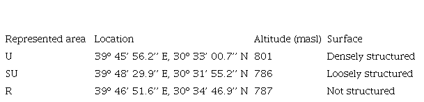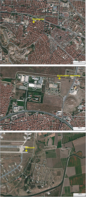 Spatial distribution of the calculated hourly PET values was dtermined using the 10-day averages and categories mentioned above with ArcGIS 10.1 software. Elevation data and land use characteristics (e.g., open green spaces, impervious surfaces, roofs which show different radiation properties) of the study area were included in the spatial analysis in the software. PET, elevation and land use data were overlapped in raster form. Points where data representing U, SU and R surface characteristics were obtained. U represents densely structured neighborhoods with 5-6 story buildings, while SU is a university campus in loosely structured open space and R is an airport base with very few buildings near the measurement point (Fig. 2).