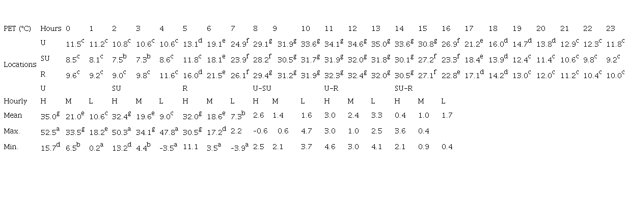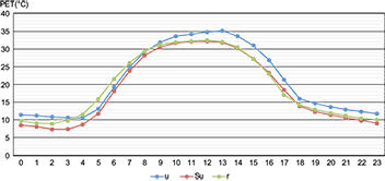The largest difference in mean PET values is seen between U and R, as expected. Between areas, differences in mean PET values are smaller than those in the averages of maximum and minimum PET values. In terms of maximum PET values, SU represents warmer characteristics than U; however, in mean and minimum PET values U is the warmest area, which is consistent with the results of previous studies.