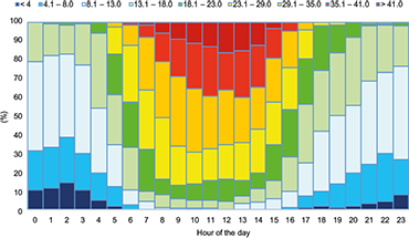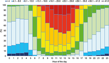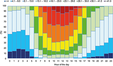 Figure 4 shows the hourly distribution of PET values in U over the whole study period. It is seen that cold and cool ranges (cold stress) are perceived from 19:00 to 04:00 LT (10 h) and between 09:00 and 16:00 LT (8 h) warm and hot ranges (heat stress) are dominant. The comfortable range spans only between 05:00 and 08:00 LT and 17:00 and 18:00 LT (6 h).