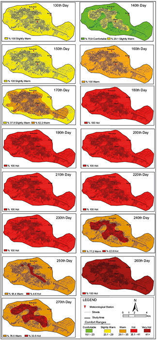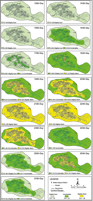 Figure 6 shows the hourly distribution of PET values in the rural area throughout the study period. Cool and cold ranges (cold stress) are seen between 18:00 and 04:00 LT (11 h) while warm and hot ranges (heat stress) are seen between 10:00 and 14:00 LT (4 h) and comfortable conditions are prevalent between 05:00 and 10:00 and 15:00 and 17:00 LT (9 h). Daily PET values were mapped at 10-day intervals to detect their spatial distribution in the city center according to the stations. It can be seen in this figure that slightly cool conditions are perceived in the whole study area when the spatial distribution of average daily PET values from day 130 to 150 day are considered. On day 160, 55.8% of the study area is in comfortable range, 44.2% is under the effect of slightly cool conditions, comfortable conditions are observed in the urban area. On day 170, 11.3% of the study area is in comfortable range and 88.7% is under the effect of slightly cool range. Comfortable conditions are determined to be prevalent in the areas covered by dense buildings and narrow streets in the city. This is because in the first and last months of the study period during nighttime and some hours of daytime, air temperature is lower in suburban and rural areas but higher in urban areas due to the UHI effect, which causes longer hours of calculated comfortable range. On the day 180, while slightly warm conditions (heat stress) are seen in densely built urban areas (3.5%), comfortable conditions are prevalent in the vast majority of the area (96.5%). Slightly warm conditions were determined in urban areas (32.8% of the whole study area) on day 190. Comfortable conditions were determined in 67.2% of the study area, covering rural and suburban areas. On day 200, a slightly warm stress was determined in the majority of urban and suburban areas and (60.6% of the study area). Comfortable conditions were perceived in rural areas and (39.4% of the study area). On days 210 and 220, a slightly warm stress was detected in the whole area. On day 230, a slightly warm stress was observed in the urban area, which accounts for 57.6% of the whole area. Comfortable conditions were experienced in the remaining 42.4% of the study area, corresponding to rural environments. On day 240, comfortable conditions were perceived throughout the whole area and on day 250 comfortable conditions were observed in urban and suburban areas. Comfortable conditions were detected in 61.7% of the area on day 250, while a slight cool stress was detected in the remaining 38.3% (rural settings). On day 260, a slight warm stress was experienced in the urban area (24.5% of the whole study area). Comfortable conditions were observed in 75.5% of the study area (suburban and rural). While the urban and suburban areas were comfortable on day 270, a slight cool stress was determined in the rural area (Fig. 7).