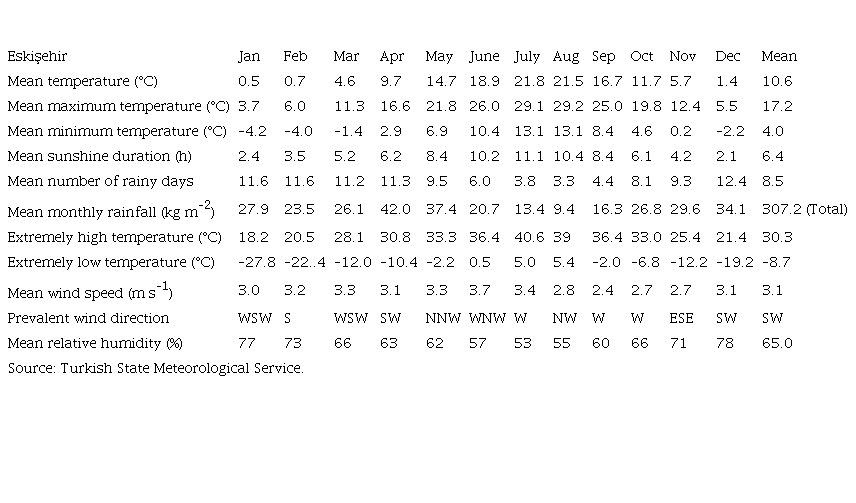 Continental climatic characteristics are prevalent in the city, with hot summers and dry, cold, snowy winters. The annual average temperature is 10.6 ºC (with extreme minimum of 27.8 ºC in January and extreme maximum of 40.6 ºC in July). Annual rainfall is 307.2 mm and relative humidity is 65%. The average annual wind speed is 3.1 m s–1 and the prevalent wind direction is SW (Table I).