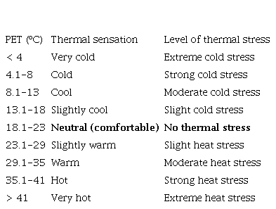 Matzarakis A, Mayer H, Iziomon MG. 1999. Applications of a Universal Thermal Index: Physiological Equivalent Temperature. International Journal of Biometeorology 43: 76-84. https://doi.org/10.1007/s004840050119