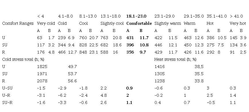 Table V shows the hourly distribution of comfort ranges throughout the day in the evaluated period. It is seen that the area where the largest number of comfortable hours is seen is U with 431 h (of 3672 h in the hot period; 11.7%), the smallest number of comfortable hours is seen in R with 356 h (9.7%), while comfortable hours in SU amount to 10.8%. U has 0.9% more comfortable hours than SU and 2% more than R, while SU has 1.1% more comfortable hours than R (TableV).