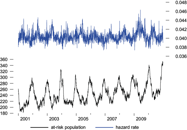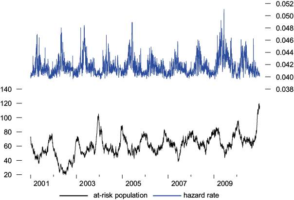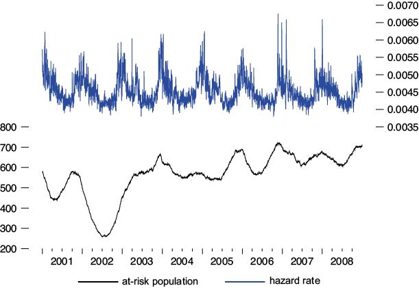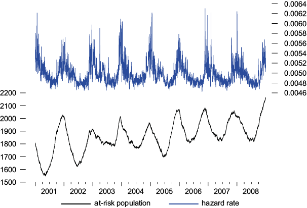 The hazard rates noticed over the sample period go from 0.0046 to 0.0063, in the case of non-accidental deaths, and from 0.0038 to 0.0067 in the case of cardiovascular-respiratory deaths. Therefore, life expectancy ranges from 158 to 217 days in the case of non-accidental deaths, and from 149 to 263 days in the case of cardiovascular-respiratory deaths.