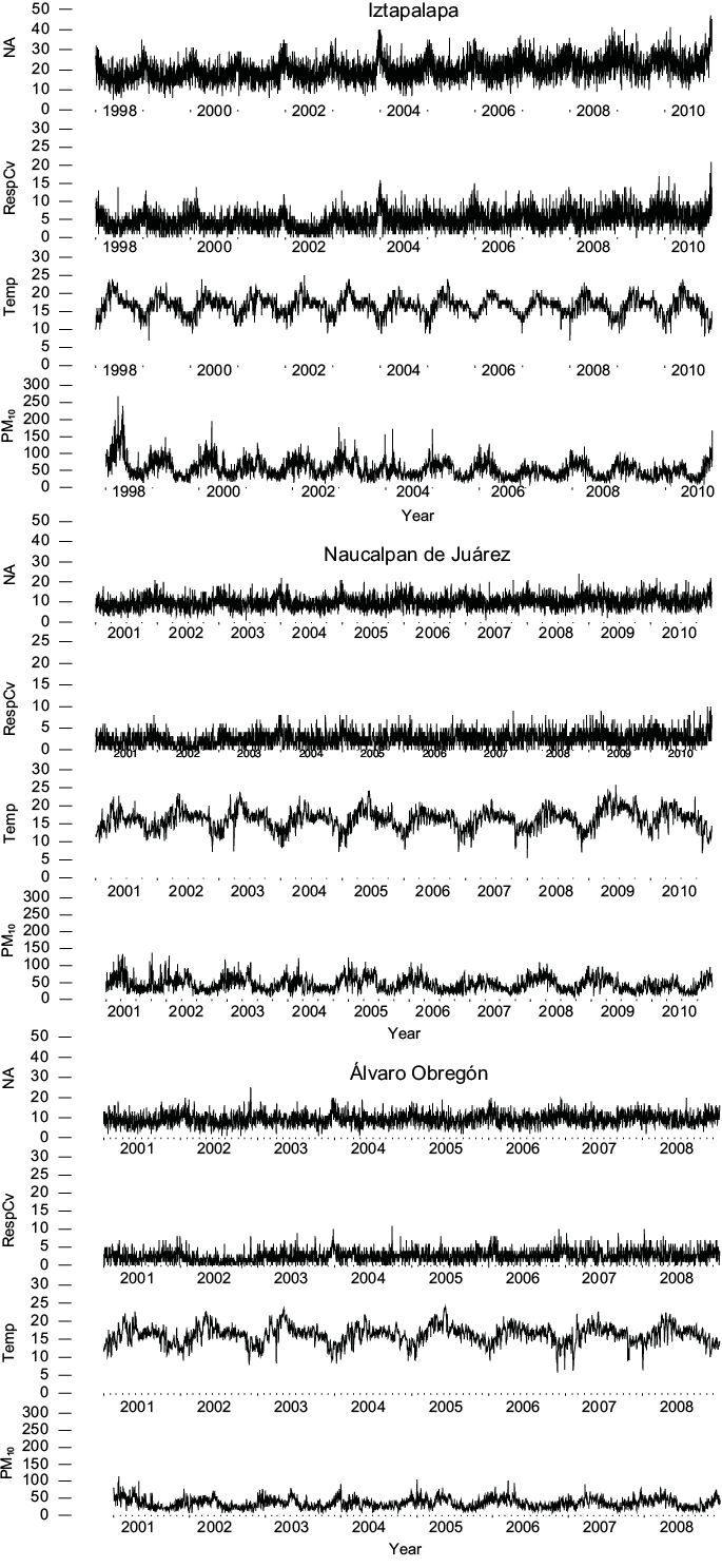 We used daily time series of air pollution, weather, and mortality data for Iztapalapa, Álvaro Obregón, and Naucalpan de Juárez for the period 2001-2010. Figure 1 shows that temperature, PM10, and death counts seem to be dominated by annual seasonal patterns, with PM10 and the daily number of deaths highest in winter. Air pollution and weather data were obtained from the monitoring system of air pollutants in Mexico City’s Red Automática de Monitoreo Atmosférico (Automatic Air Quality Monitoring Network; RAMA), which currently has 47 stations located all over Mexico City’s Metropolitan Area. The station runs 24 h during the 365 days of the year. Separated samples of PM, based on a measurement of particles with aerodynamic diameter less than or equal to 10 µm (PM10) per cubic meter and temperature, were obtained for each municipality. The hourly measures were collapsed over the 24-h period to obtain a mean value for PM10 and ambient temperature6. Daily numbers of deaths were obtained from the National Center of Health Statistics for the same time period. Deaths due to accidental and other external causes according to the International Classification of Disease 10th revision (ICD-10) were excluded. We also separated deaths into those that are likely to be related to pollution levels and those related to other causes. Therefore, separate counts were also computed for deaths related to diseases of the respiratory system (ICD-10, causes J) and deaths related to diseases of the circulatory system (ICD-10, causes I).