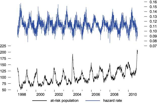 Figures 4 and 5 plot the Kalman filter estimates of the at-risk populations along with the estimated hazards rates in Models 5 and 3, respectively. The estimated at-risk population average is 245 for non-accidental deaths, while the average is 60 for cardiovascular-respiratory deaths, and, as in the case of Iztapalapa, it varies seasonally with the daily number of deaths, being the highest in winter. Since average mortality is 9.91 and 2.53 per day, this implies that about 4.0 and 3.3% of the at-risk population dies on average per day in the non-accidental and cardiovascular-respiratory populations, respectively. As in Iztapalapa, the hazard rates fluctuate seasonally as periods of high emissions of PM10 and of extreme temperature gather a grim harvest, followed by less lethal conditions. We observe that the estimated at-risk population series does move higher with time, from an average of 232, in the first years, to around 263 in the final years for non-accidental deaths, while it moves from an average of 60 to around 70 in the same period for cardiovascular-respiratory deaths. There is a corresponding and offsetting decline in the hazard rate, moving downwards from an average of about 0.040 to 0.039 for non-accidental deaths, while it moves downwards from 0.041 to 0.040 for cardiovascular-respiratory deaths in the same period. This decline in hazard rates is driven by a reduction of PM10 emissions of about 47.16 to 43.90 µg m–3 during the early and later years, respectively.