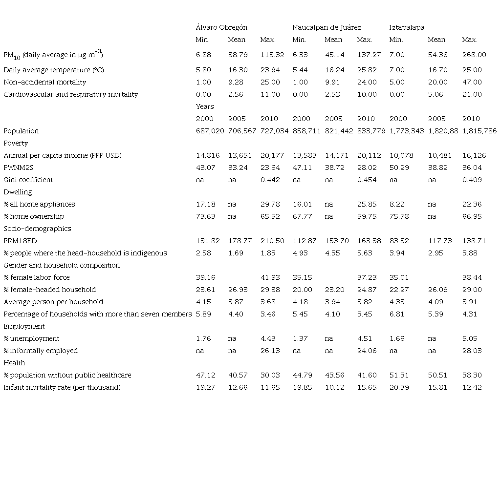 Table I shows that, while variations in the average daily temperature in any of these municipalities are not high, variations in daily average pollution are. For example, the daily average level of PM104 range between 6.88 and 115.32 µm m–3 in Álvaro Obregón, while for Iztapalapa the daily average level ranges between 7.00 and 268.00 µm m–3. Large differences in pollution emissions will imply different hazard exposures to those municipalities. According to impact studies about urban vulnerability, the risks of adverse health impacts depend on two different factors. The first one is related to the origin of the hazard for urban populations, while the second is related to the socioeconomic conditions influencing the exposure, the sensitivity and the responsiveness to risk, as well as its effects on health, all of which may reflect inequalities in the access to services and well-being systems. Therefore, it is important to explain the current environmental and socioeconomic situation of these municipalities.