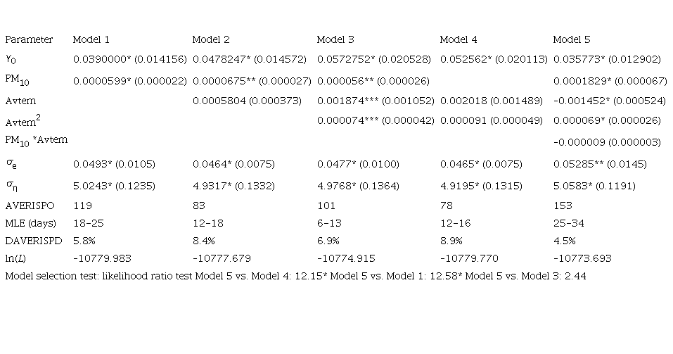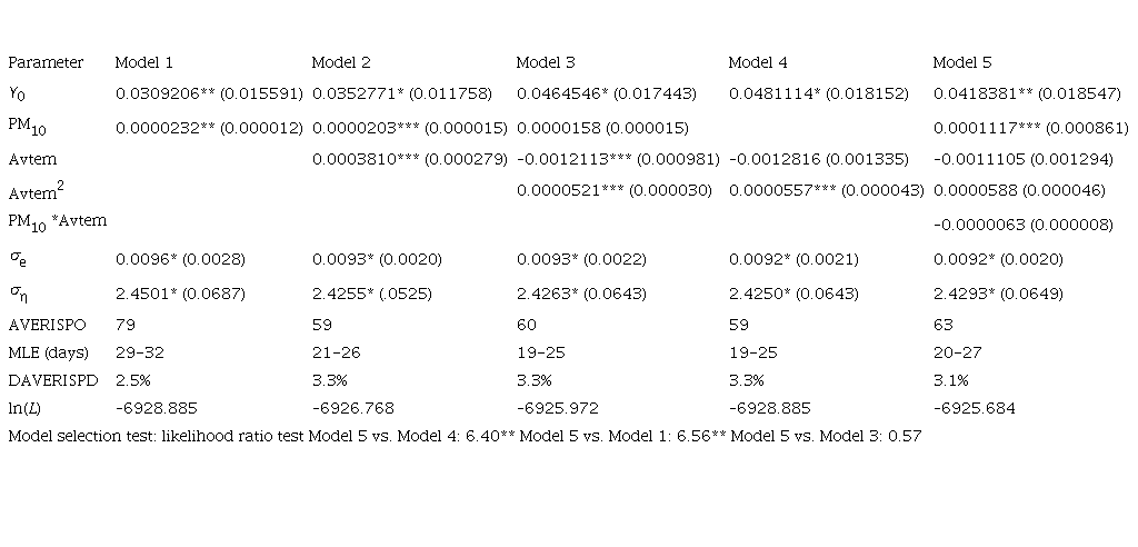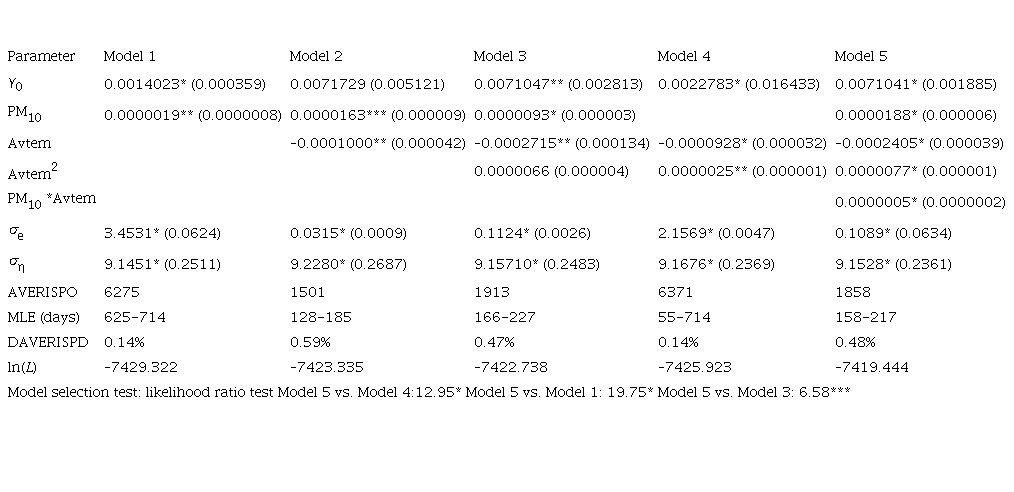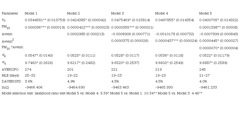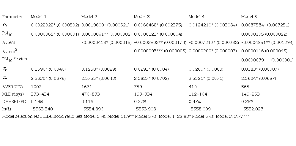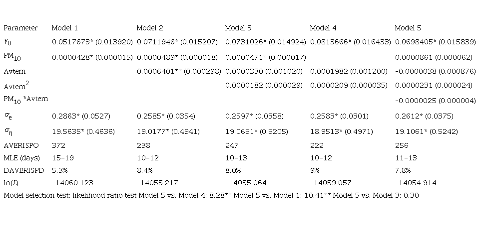 Using Kalman filters, we estimated the observation and state equation by maximum likelihood. Tables II to VII report the estimates and asymptotic standard errors of the five baseline settings of the risk function including various combinations of PM10 and average temperature (Avtem), the square of temperature, and the multiplicative interaction of PM10 with Avtem. A constant term is included in each one of the risk functions. Model 1 uses only PM10. Model 2 adds Avtem to Model 1. Model 3 adds the square of Avtem allowing for hazard rate that increases at both extremes of temperature. Model 4 is included for comparison purposes and uses only the Avtem variable. Finally, Model 5 allows the effect of PM10 and Avtem, so they depend on the value of each other by adding the Avtem*PM10, an interaction variable. Estimates are produced using the Kalman smoother, which uses all information available in the sample, thus providing a better in-sample fit, as compared with the basic Kalman filter, which only uses information available at time t.