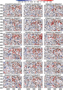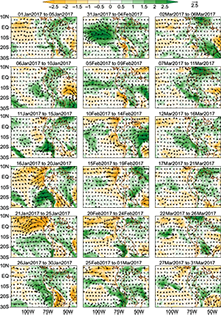 Between January 21 and 25 the northerly anomalies in the wind were most prevalent in the analysis region. In the period between February 10-14, the highest intensity of westerly anomalously winds over 110º-90º W was observed, while March was characterized by westerly and northerly anomalous winds (Fig. 5). It is also clear that in the second half of February there was an absence of rainfall in the region.