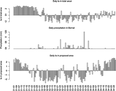 With the aim of identifying the daily ITCZ second band formation, we calculated the Ia index considering the areas proposed by Yu and Zhang (2018) (Fig. 10, upper panel) and a new proposed area (Fig. 10, lower panel), and compared them with the daily precipitation gauged in the Bernal coastal station (Fig. 10, middle panel). The first day with an important daily precipitation in Bernal (30 mm) was January 30, and the identification of the ITCZ second band (negative Ia) in new proposed areas was on January 19, 11 days prior to the occurrence of a maximum precipitation. This lag would allow anticipating the occurrence of rain on the coast with more than 10 days of advance; however, this is not possible with the Ia calculated in a total area, which showed a negative value on February 6, one week after the first important daily precipitation in Bernal. This lag may be explained by Sulca et al. (2017), who showed that the integrated moisture transport in periods with positive ITCZE index (ITCZ for the eastern Pacific) is from the west to the east in northwest Peru; as such, the ITCZ second band formation becomes more important in the prediction of rain in that region, especially if it can be identified with days of anticipation.