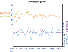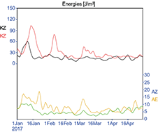 On the other hand, CZ has more variability, mainly in February and March, oscillating between negative and positive values, changing the flux of conversion, manifesting the similar importance of KZ and AZ during the convection of ITCZ second band region. CE has only positive values, with a maximum in the second half of March, indicating that the increase of KE observed in this period in Figure 11 is due to conversion from AE.