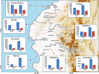 According to Ramírez and Briones (2017), economic losses due to coastal El Niño-related precipitation were estimated at USD 3.1 billion and affected over 1 million people (INDECI, 2017), with at least 113 killed and nearly 40 000 homes destroyed (Fraser, 2017). The most affected Peruvian regions were Piura, Lambayeque, La Libertad and Lima. An array of infectious diseases, like dengue, chikungunya, zika and leptospirosis, also were reported (Ramírez and Briones, 2017), triggered by stagnant water, increased humidity and warm air temperatures observed during this period (1-2.5 ºC above its normal between January and March) (ENFEN, 2017a, b).