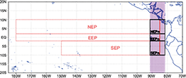 Yu and Zhang (2018) proposed an index to identify the ITCZ second band formation, working with monthly precipitation averaged in three areas (Fig. 3), the northeastern equatorial Pacific (NEP; 180º-85º W, 2º-10º N), the southeastern equatorial Pacific (SEP; 150º-85º W, 10º-2º S), and the eastern equatorial Pacific (EEP; 180º-85º W, 2º S-2º N). In this work, these areas are used to calculate the Yu and Zhang index with monthly and daily satellite estimated precipitation data; also, a new area to identify the formation of the ITCZ second band near the Peruvian coast is proposed. The longitudinal limits of this new area are 91.5º-81.5º W (purple area in Fig. 3), and the same latitudinal limits of NEP, SEP and EEP.