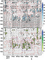 In 600 hPa (Fig. 8), the positive anomalies of mixing ratio (MIXR) in the region of the ITCZ second band near the coast developed around January 21-25, with highest intensity between January 31 and February 4 and positive MIXR flux from east to west. From February 10 to March 1, negative anomalies of MIXR in the region of the ITCZ second band can be observed near the coast, associated with the decrease of rainfall in the second half of February (Figs. 5 and 7). In the first half of March, positive anomalies of MIXR were observed in the region of analysis and the flux was from the west (second band of the ITCZ region) to the east (north of Peru), this is similar to what Sulca et al. (2017) found for the the ITCZ eastern Pacific configuration (ITCZE).
