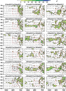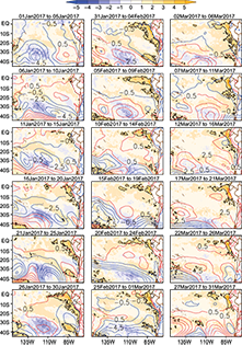In early January, an anomalous westerly wind over the equatorial Pacific was observed, which preceded the formation of the ITCZ second band near the coast between January 31 and February 4, 2017 (Fig. 5). This is congruent with Peng et al. (2019), who manifested that these strong westerly winds, which were the largest for January since 1981 (Takahashi et al., 2018), together with anomalous northerly coastal winds, caused the downwelling Kelvin waves, also found by ENFEN (2017a).