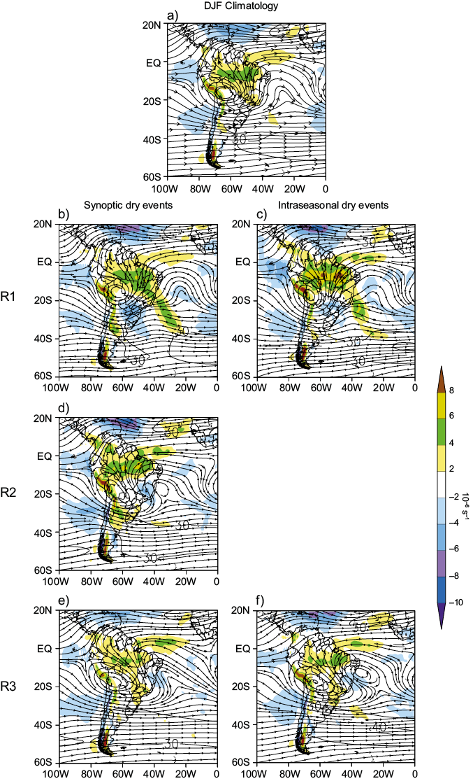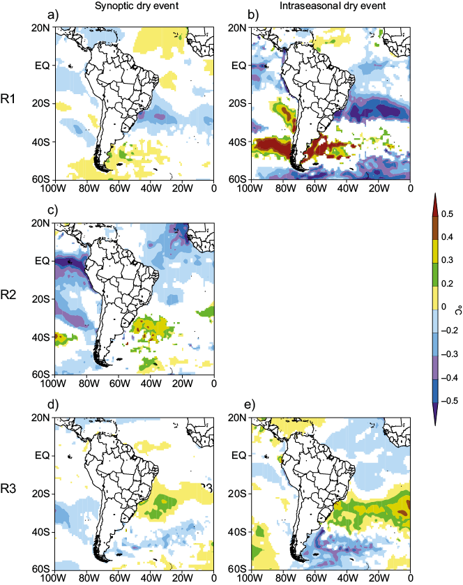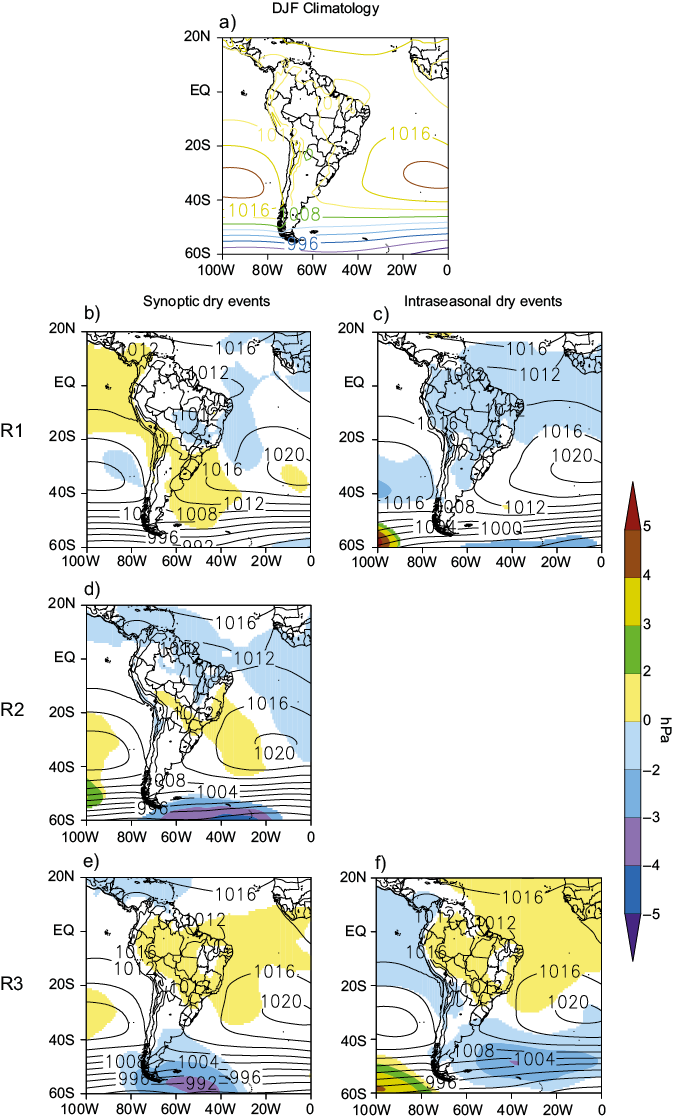 Now, looking specifically at South American atmospheric conditions, anomalous patterns with some resemblances to those observed in the 500 mb geopotential height fields are also observed in the mean sea level pressure (MSLP) fields (Figs. 9b to 9f), demonstrating the barotropic nature of the anomalies. For events in R1 (Figs. 9b and 9c), it is verified a prevalence of positive (negative) anomalies over the extratropics (tropics) in South America. In contrast, the opposite is noticed in R3 (Figs. 9e and 9f). It denotes a South Atlantic Subtropical High (SASH) inclined and extended to the southwest for events more to the south (R1 cases) and inclined to the northwest in northern cases (R3 cases) when this SASH’s continental approach to the South American continent contributes to the atmospheric stabilization over the regions of dry events.