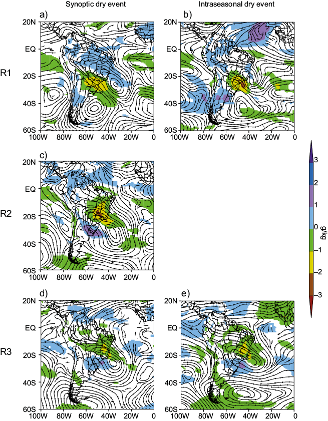 Figure 11 shows wind and specific moisture anomalies at 850 mb. In the R1 events (Figs. 11a and 11b), a cyclonic anomaly is verified near the SEB coast, which contributes to reinforcing the western wet flux over the northern SEB and northeastern Brazil and inducing an anomalous drier eastern flux over the southern part of SEB, where R1 is located. The presence of an anomalous anticyclone is verified near the southern and southeastern coast of Brazil for events in R2 and R3 (Figs. 11c to 11e). Such circulation is associated with the intensification and displacement of SASH towards the east coast of Brazil. In all the R2 and R3 cases, the associated circulation intensifies the South American Low-Level Jet (SALLJ) east of the Andes, channeling the wet stream towards southern Brazil and SESA. One noticeable aspect common to all anomalous wind fields is the eastern component with associated moisture deficit over the study regions, as is also verified in Muza et al. (2009) in a study about dry events variability on an intraseasonal and interannual scale. This anomalous eastern component is responsible for weakening the northwestern wet climatological flow over each study region and contributes to the shortage periods.